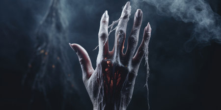 Decaying vampire hand, withered by daylight, reveals a tale of ancient curses and doom. Created with generative AI tools