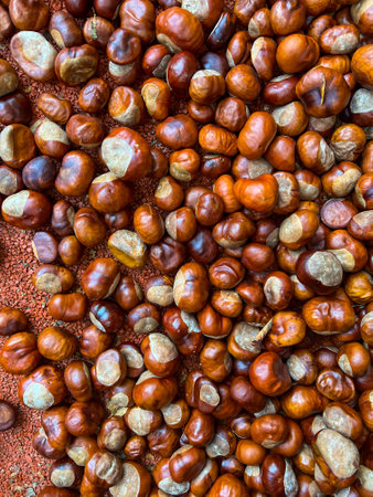Texture of chestnuts on a pile, autumn pattern wallpaper