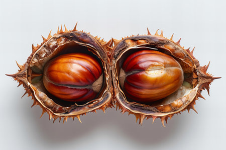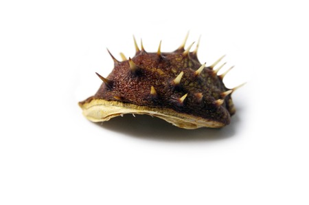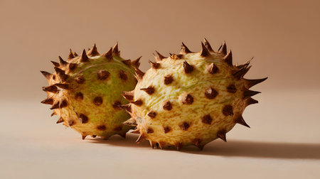 A spiky chestnut seed pods on warm cream background with natural texture and soft shadow, autumn still life mood