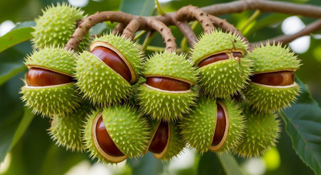 A closeup of chestnut on a tree under the sunlight with a blurry background