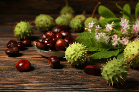 Brown shiny chestnuts for crafts and as medicine in autumn
