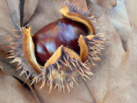 Chestnut fruit with peel on fallen leaves,chestnut fruit on autumn leaves macro,macro photography,stock image