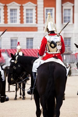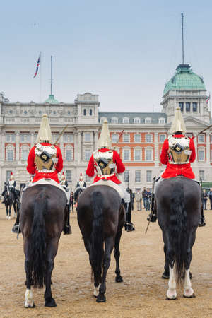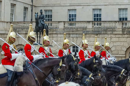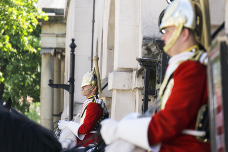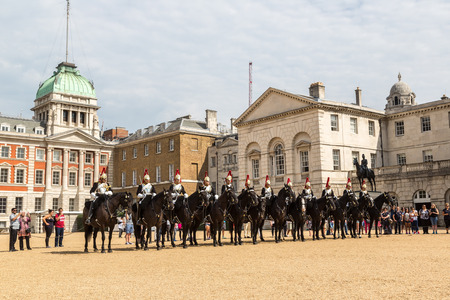 LONDON, UK - MAY 13 2015:Mounted troopers of the Household Cavalry during ceremony at Horse Guards.The soldiers charged with guarding the official royal residences in the United Kingdom.