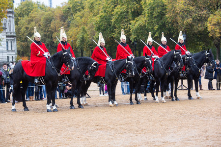 LONDON UNITED KINGDOM, OCTOBER 23 2018: guards on the horses at the Buckingham Palace during the traditional Changing of the Guard ceremony London United Kingdom. Editorial use.