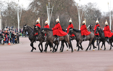 LONDON - JULY 4: Horse Guards arrive to Buckingham Palace during Changing the Guard ceremony on July 4, 2012 in London. Changing the Guard takes place at 11.30 am daily from May to July.