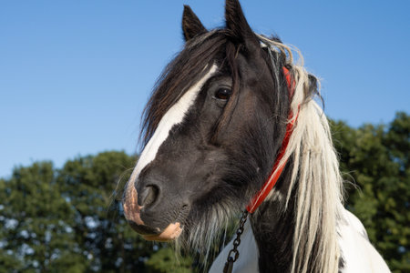 Portrait of a red stallion against the blue sky. A beautiful horse with a long black mane. Light horse with a dark mane
