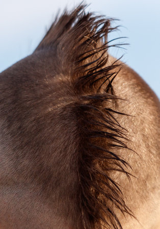 horses mane close-up. The horses neck. The peach color of the coat. Background blue sky. horizontal photo