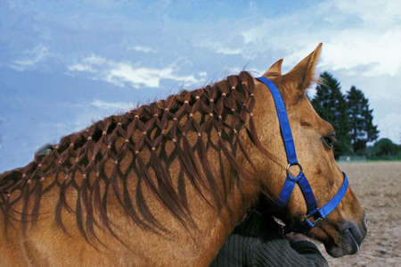 Horse ears and braided mane of a dressage horse. Pigtails on neck sports brown horse. Equestrian sport. Dressage of horses in the arena. Horseback riding.