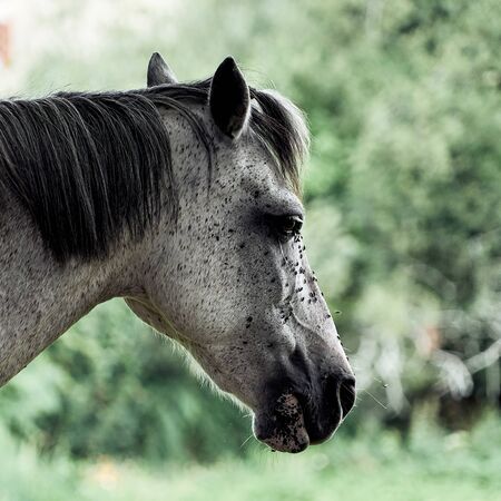 Portrait of gray horse looking with interest