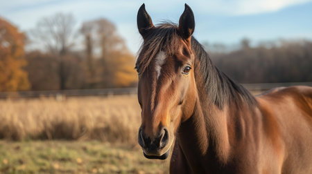 Golden Hour Grace A Serene Portrait of a Majestic Brown Horse Bathed in Warm Autumn Sunlight