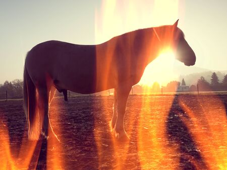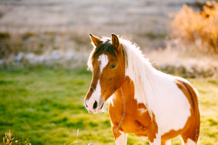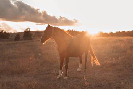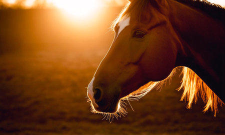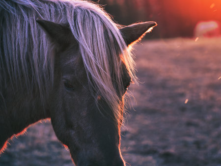 A portrait of a stallion with a magnificent mane illuminated by the rays of sunset creates a mysti.