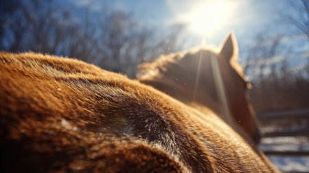 A horse stands in a tranquil outdoor setting, basking in warm sunlight that highlights its glossy coat, creating a serene and picturesque moment.