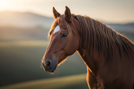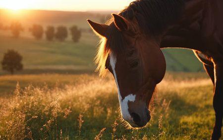 Golden Hour Serenity, Portrait of a Chestnut Horse Tranquil Morning in a Dewy Meadow