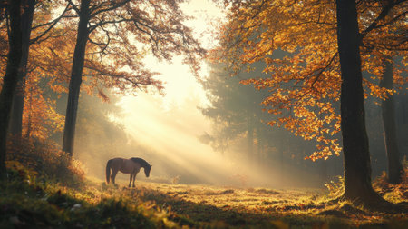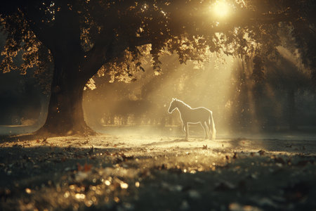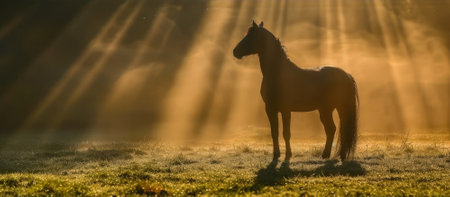 A horse stands gracefully in a misty field, illuminated by golden sunlight rays at dawn. Copy space
