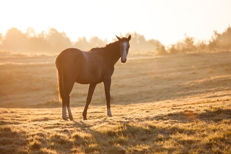 Portrait of English thoroughbred foal at sunset looking at the camera. Light background with copy space.
