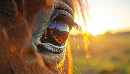 A breathtaking macro view captures the world reflected in the gentle eye of a horse. As the golden sun sets over a tranquil field, its warm light illuminates every detail, from the long eyelashes to the peaceful landscape mirrored in the pupil. This image evokes a sense of calm, connection with nature, and the quiet beauty of a rural evening.