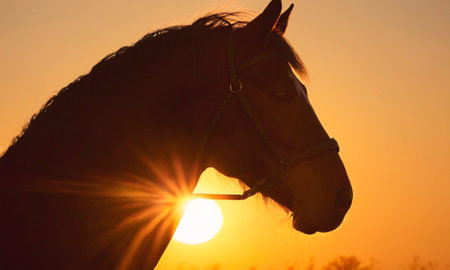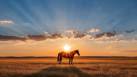 A lone horse stands majestically silhouetted against the warm glow of a setting sun. Bathed in golden light, the tranquil scene evokes a sense of peace, freedom, and the quiet beauty of nature at the end of the day.