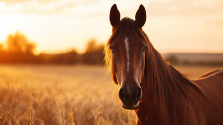 A brown horse stands gracefully in a sunlit field of golden grass during sunset showing natural beauty.