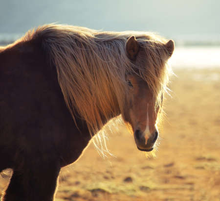 Icelandic horse on the field of scenic nature landscape at countryside in Iceland