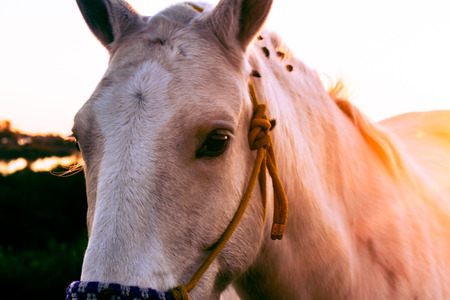 Approaching a head of a white horse. Domestic animal with mooring straps.