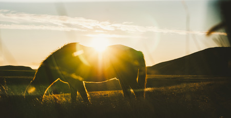 Icelandic landscapes, sunset in a meadow with horses grazing backlight