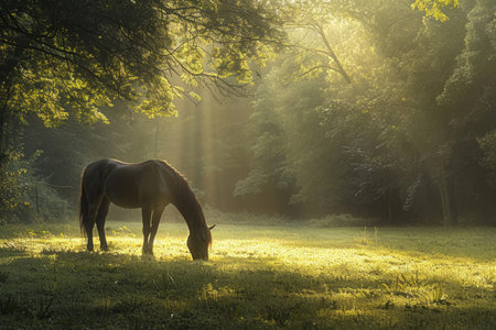 A serene forest offers a beautiful view of a horse peacefully grazing in a grassy area surrounded by trees. Soft sunlight beams through the branches, creating a magical atmosphere.
