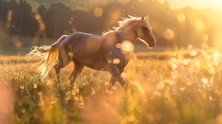 Chinese zodiac horse running at dawn across a serene landscape, with the warm glow of the rising sun illuminating its powerful form and the peaceful surroundings.