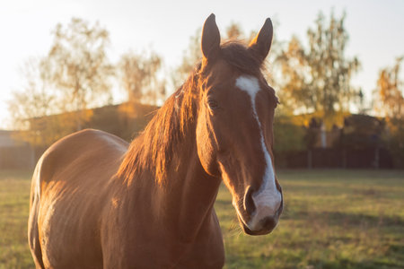 A brown horse looks into the camera. Portrait of a horse. ranch at sunset