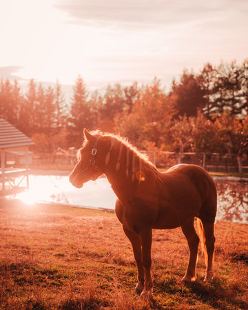 Golden Hour Grace A Serene Portrait of a Majestic Brown Horse Bathed in Warm Autumn Sunlight