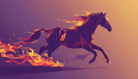 A powerful horse in full gallop, its mane and tail ablaze with vibrant flames, set against a dramatic, gradient background.