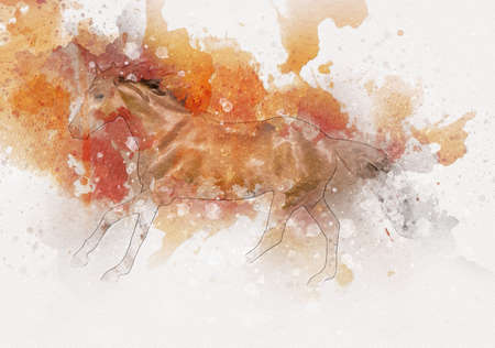 Horse running on watercolor splashes background, vector illustration.