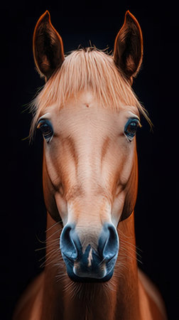 Portrait of a horse with blue eyes on a black background.
