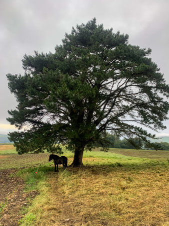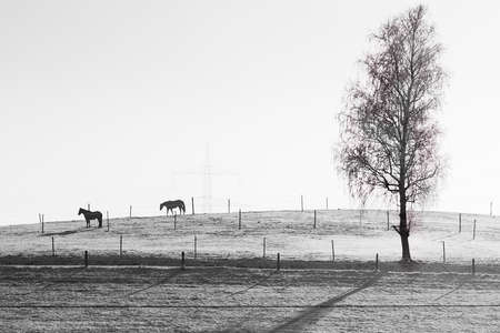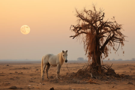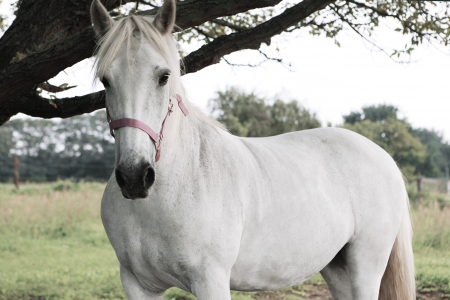 backlit soft image of a lone grey horse stood under a tree with dew on the ground at sunrise