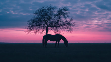 A majestic horse stands silhouetted beneath a leafless tree at sunset, creating a tranquil scene with vibrant pink and purple hues in the sky.