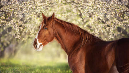 Beautiful horse portrait standing in front of flowering plum trees. Panorama. Banner