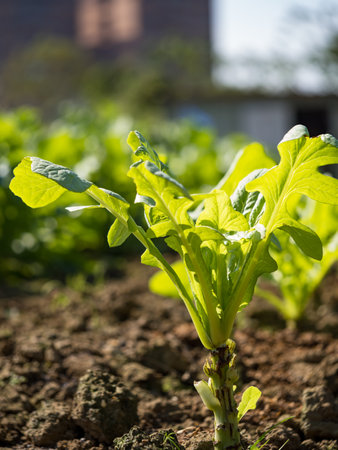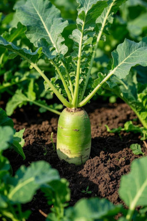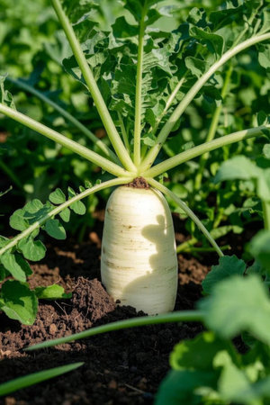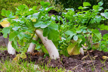 Daikon in the bed in natural conditions. Root vegetable in the ground