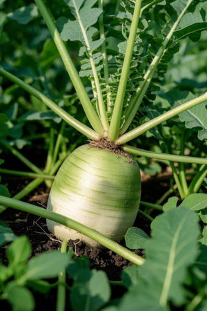 Fresh Turnip Growing in Soil with Green Leaves and Roots Visible