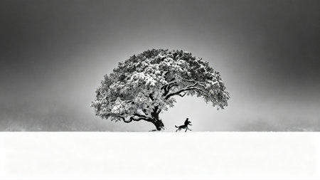a whimsical yet eerie animal symbolism-inspired tree stands tall in a snow-covered field. with a shallow depth of field, the minimalist pink and brown tones create a festive atmosphere. this captivating fawncore scene merges enchantment and mystery seamlessly. ai generated