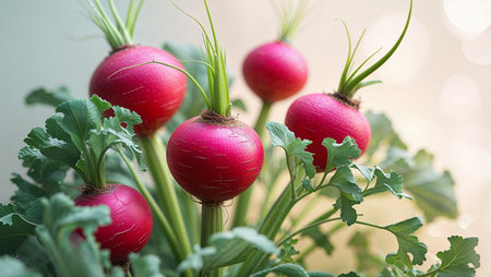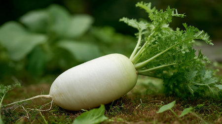 This image showcases a fresh white radish with lush green leaves, highlighting its vibrant colors. Ideal for culinary and health-focused recipes.