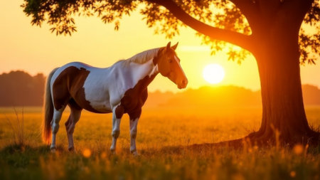 Stallion grazes in tranquil meadow at sunset generated by artificial intelligence