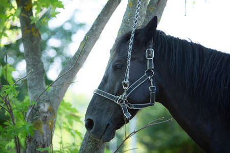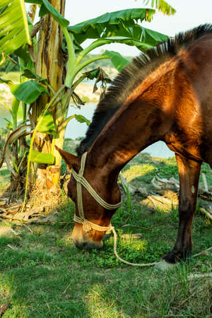 The nice red and black horse eats grass into the forest and near the river, two basic pigment colors of horse hairs are red or reddish-brown color and black
