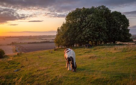 Horses pasturing in a rural landscape under warm sunlight with blue yellow and orange colors grazing grass trees and outstretched view in avesbury england