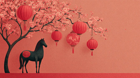 This stunning artwork features a graceful horse silhouette beside a cherry blossom tree adorned with vibrant lanterns, encapsulating cultural beauty and tranquility.