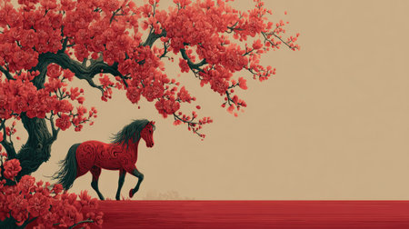 This artistic illustration features a majestic red horse walking gracefully under a cherry blossom tree, petals cascading in a serene background.