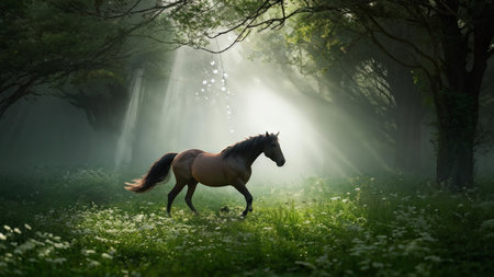 A realistic depiction of a horse galloping through a misty forest illuminated by beams of sunlight filtering through the trees above. The scene is rich with natural elements such a