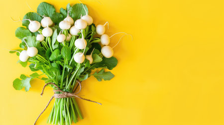 A vibrant bouquet of fresh white radishes with green leaves, set against a bright yellow background. Ideal for food photography, healthy recipes, and culinary art.