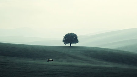 A lone sheep walking across a lush green pasture, with rolling hills and a tree silhouette against the horizon.