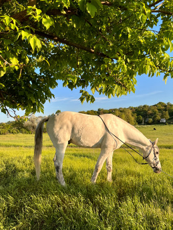 White horse grazes on the meadow next to the tree against beautiful landscape.