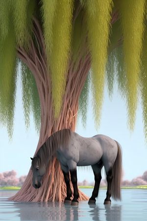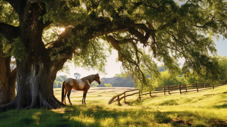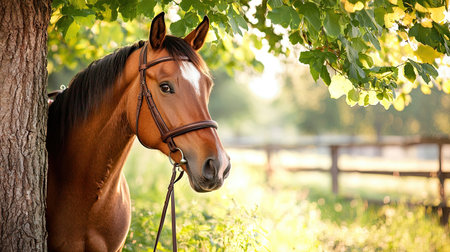 A serene portrait of a majestic horse gazing from behind a tree. The warm sunlight filters through vibrant greenery, creating a peaceful, enchanting atmosphere.