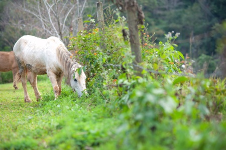Beautiful white majestic white horse eat grass in springtime. VAshlovani national park in Georgia